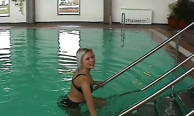 Solo babe Milka Wey plays in the pool and drops her killer bathing suit